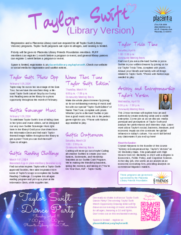 Registration and a Placentia Library card are required for all Taylor Swift (Library Version) programs. Taylor Swift programs are open to all ages, and seating is limited.